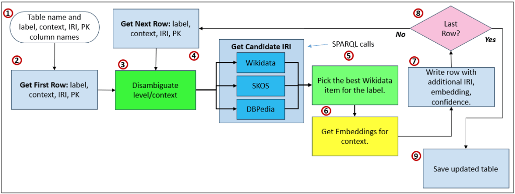 - Write enriched row Write the original row back with the selected IRI, confidence score, rationale, and any embeddings added as supplemental metadata.